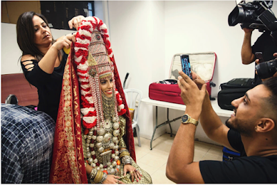 | The groom takes pictures of his bride while she dresses for their pre-wedding henna ceremony. |