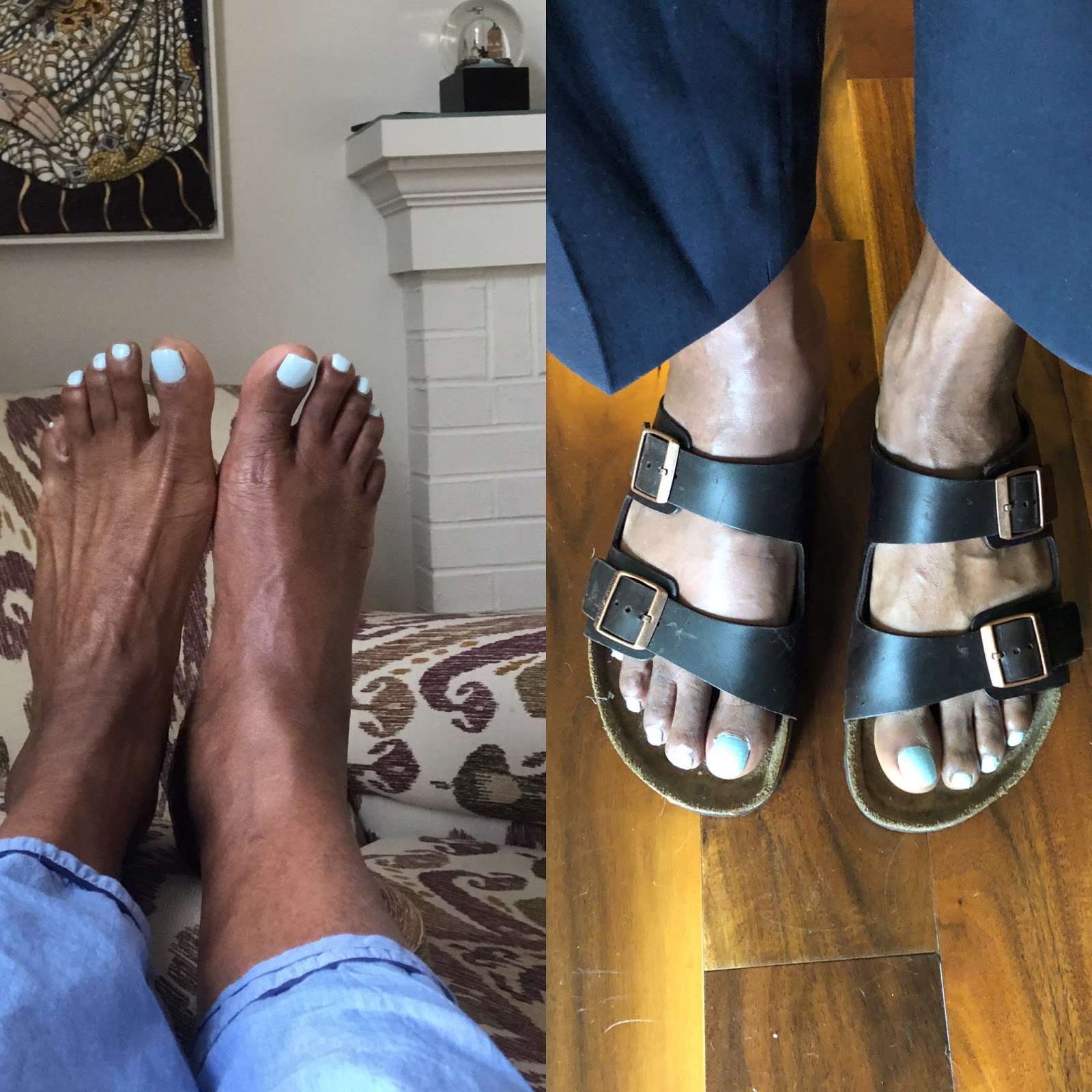 | Ernest Disney-Britton's pedicured toenails in baby blue |