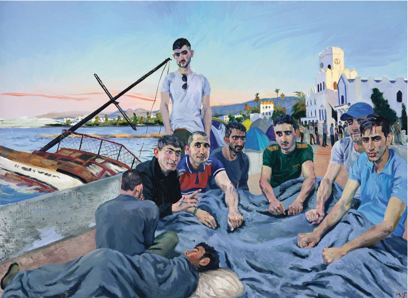 | Artist Liu Xiaodong in 2017 in front of his painting “Refugees 4” (2015) |