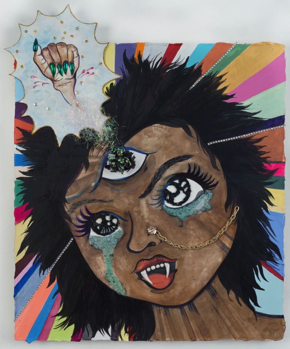 Chitra Ganesh began using glitter for costumes and celebrations. As a young artist, she said the material took on “a queer sensibility, as a way to perform, mark, or alter gender expressions.” Ganesh’s figurative compositions still evidence a youthful approach. Power Girl (2015), for example, plays on superhero tropes to transform a young, non-white woman with a sparkling nose ring into a potent and formidable character—a Powerpuff Girl, but edgier. Ganesh’s oeuvre, as a whole, maintains this cartoonish, feminist edge. [