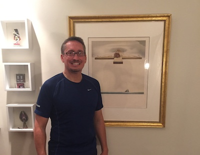 | Gregory Disney-Britton stands beside his newly acquired print Christ of Gala (Crucifixion) by Salvador Dali on Japon paper with Embossed Signature, 1981 HC 60/75 |